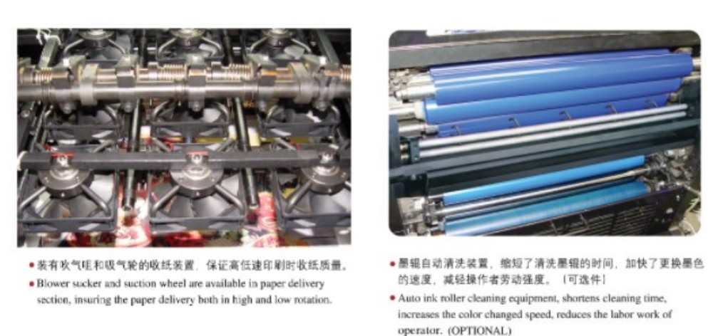 دستگاه چاپ افست بسته بندی چهار رنگ بزرگ A3 با ماژول های با کارایی بالا طراحی شده است و همه آنها دارای کیفیت بالا هستند - غلتک ها و چرخ دنده های با دقت بالا، مکانیزم تغذیه کاغذ قوی، سیستم ثبت کاغذ با دقت بالا و سیستم تامین جوهر پایدار. این برای پاسخگویی به نیازهای بازار برای چاپ رنگی با کیفیت بالا، کارآمد و مقرون به صرفه طراحی شده است. لازم نیست فقط به یک ضخامت کاغذ بچسبید - با کاغذ نازک (0.04 میلی متر) تا مقوای ضخیم (0.4 میلی متر) کار می کند. همچنین یک کنترل صفحه لمسی با یک رابط برنامه نویسی بصری وجود دارد که به شما امکان می دهد تنظیمات و پارامترهای چاپ را به روشی هوشمندانه و ساده تنظیم کنید.