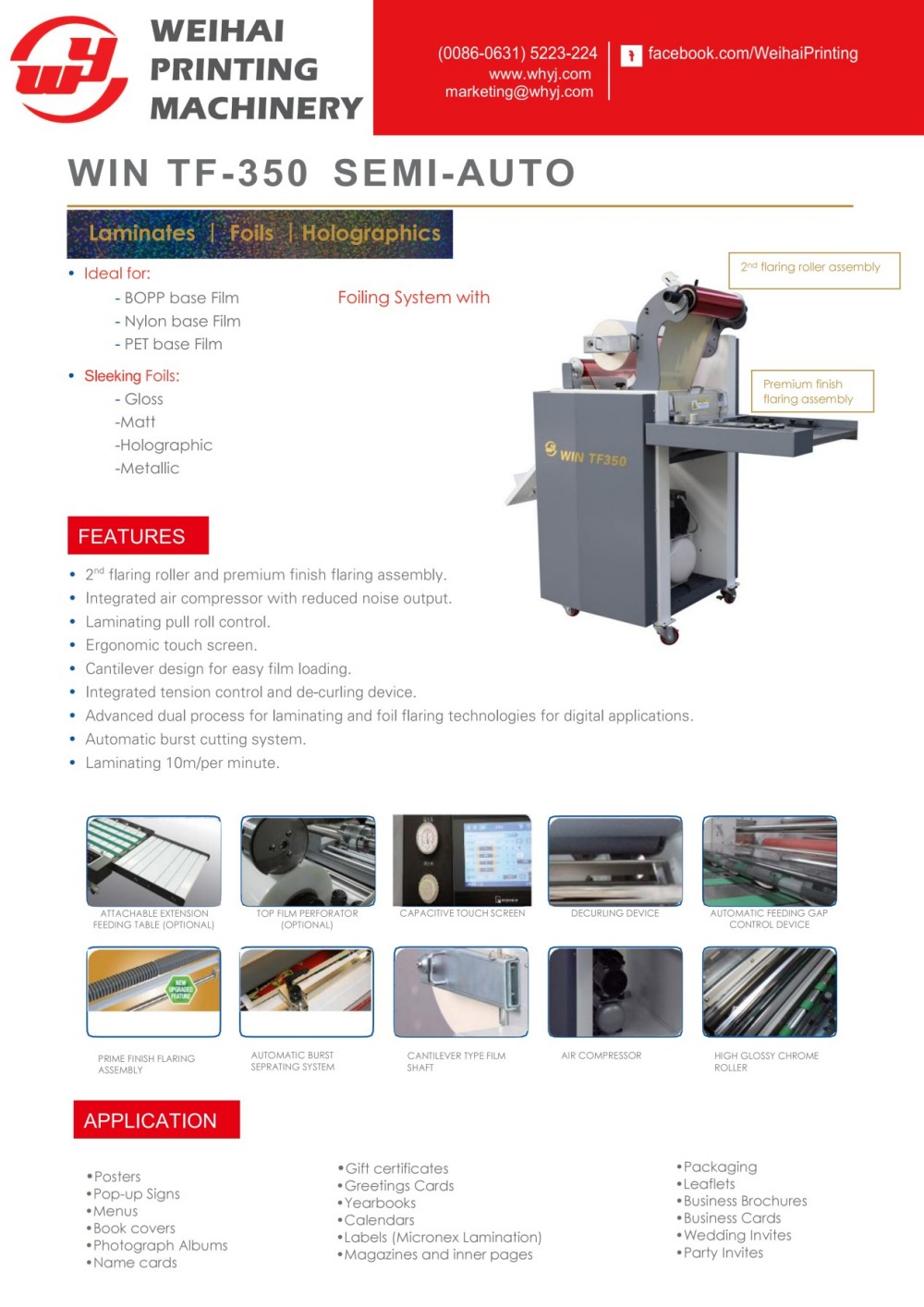 دستگاه لمینت و فویلینگ دستی یک دستگاه لمینت و فویلینگ با کاغذ دستی است که توسط Weihai Printing Machinery Co., Ltd. طراحی و تولید شده است. این می تواند مواد چاپی معمولی را به محصولات نهایی نفیس با درجه بالا تبدیل کند و با برنامه های کاربردی دیجیتال بر اساس تقاضا و چاپ های افست لیتوگرافی سنتی کاملاً سازگار است. برای اطمینان از نتایج پردازش بهینه، دستگاه مجهز به یک دستگاه کنترل الکترونیکی است که فشار غلتک و دمای گرمایش را در حین کار با توجه به متغیرهای کلیدی مانند سرعت کار، ضخامت کاغذ و الگوهای طراحی تنظیم می کند. به عنوان یک تجهیزات لمینیت و مهر زنی با تغذیه دستی با کارایی بالا، تأیید شده است که ارزش افزوده محصولات مشتریان را به میزان قابل توجهی افزایش می دهد. مشتریان می توانند از میان طیف گسترده ای از فیلم های لمینیت و فویل های فلزی برای برآوردن نیازهای تزئینی متنوع انتخاب کنند. علاوه بر این، با یک میز تغذیه کاغذی گسترده برای قرار دادن بنرها و مواد چاپی بسیار بلند مبله شده است.
